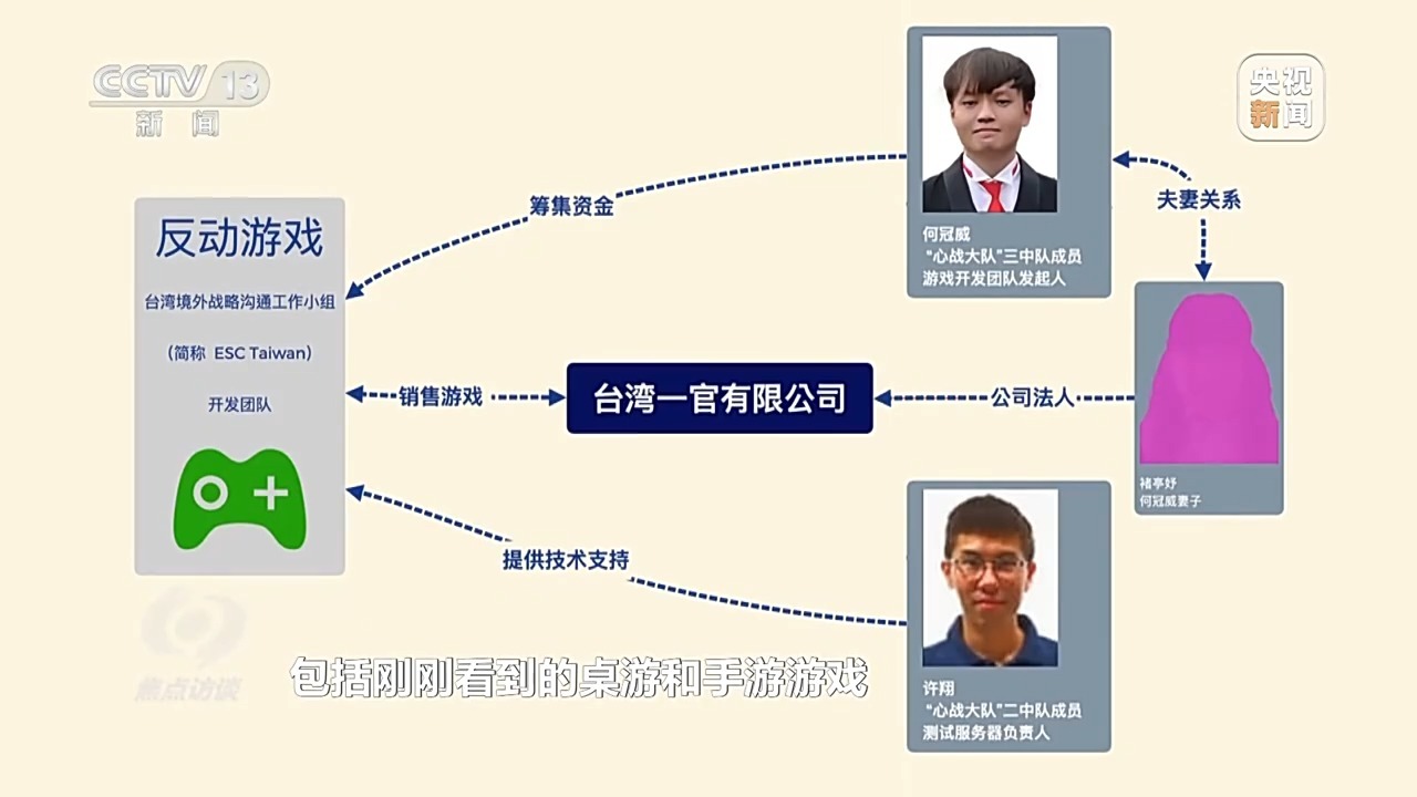 福建省厦门市公安局 民警:“台湾境外战略沟通工作小组”简称“ESC”,设计了一系列包括桌游和手游游戏,以一官有限公司的名义销售、传播。经过我们查证,这家公司的法定代表人是褚婷妤,而褚婷妤正是这次悬赏通告18人之一的何冠威的配偶。何冠威牵头筹集资金,许翔提供技术支持,持续通过一系列游戏宣传“台独”和煽动分裂国家。