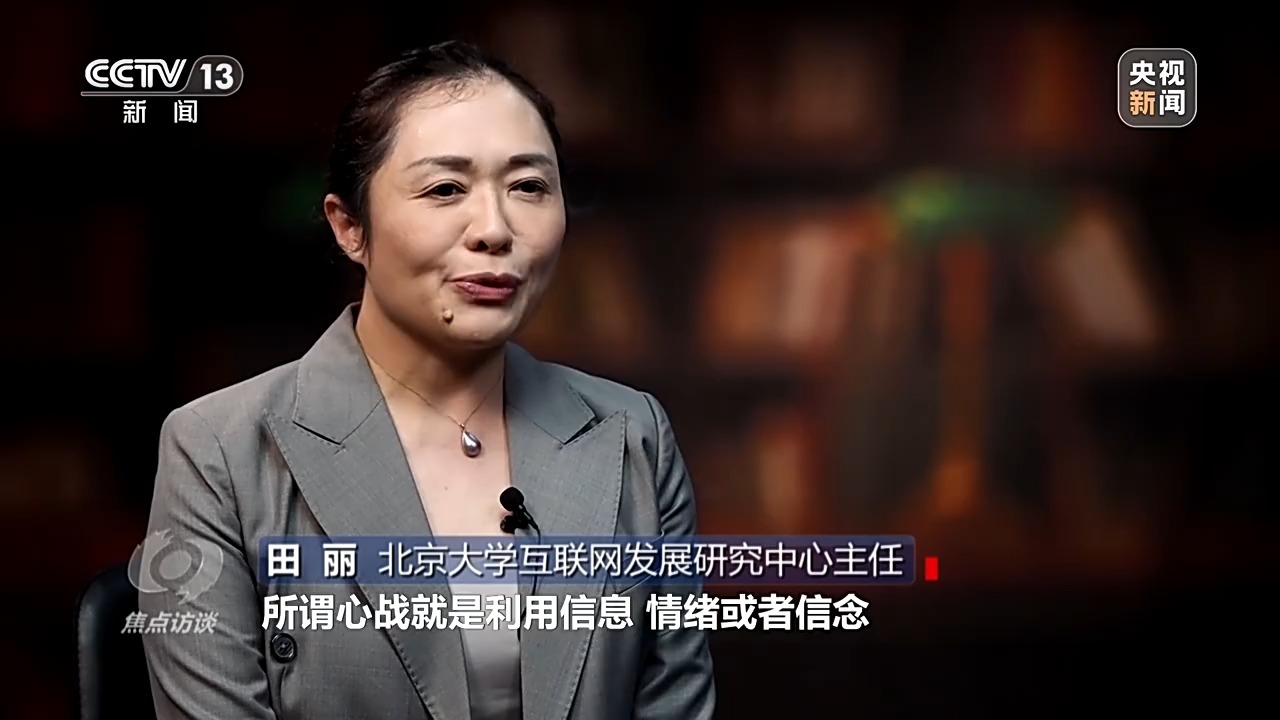 北京大学互联网发展研究中心主任 田丽:所谓心战就是利用信息、情绪或者信念摧毁对方的意志,不需要硝烟,依旧能够对人产生威胁。利用各种媒介产品,包括谣言或者其他心理暗示,让人放弃自我主张。认知战是心理战的升级版,通过比如控制你的信源,诱导你按照他的思路去加工信息。认知战的危害不在于它让人倒下,而在于它让社会分裂。